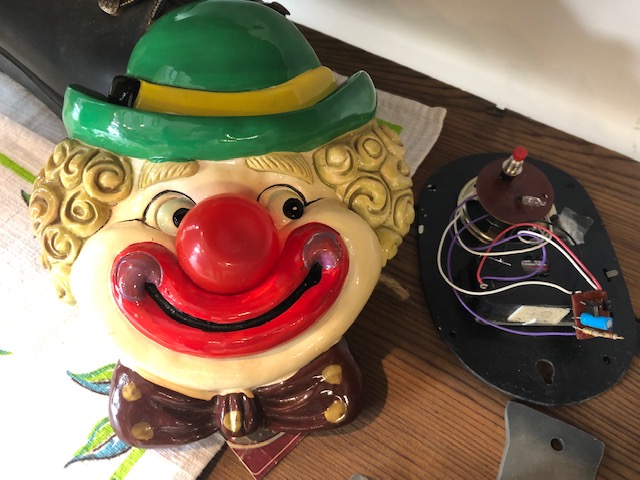 Measuring 18cm tall and 16cm across at widest point, this vintage clown face still has the workable music box and light. Does need some TLC…but everything is there.