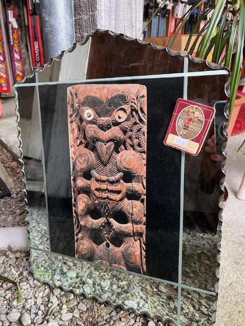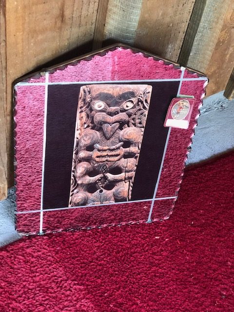 Measures 46cm height, 35cm width. Chain across wooden backing.